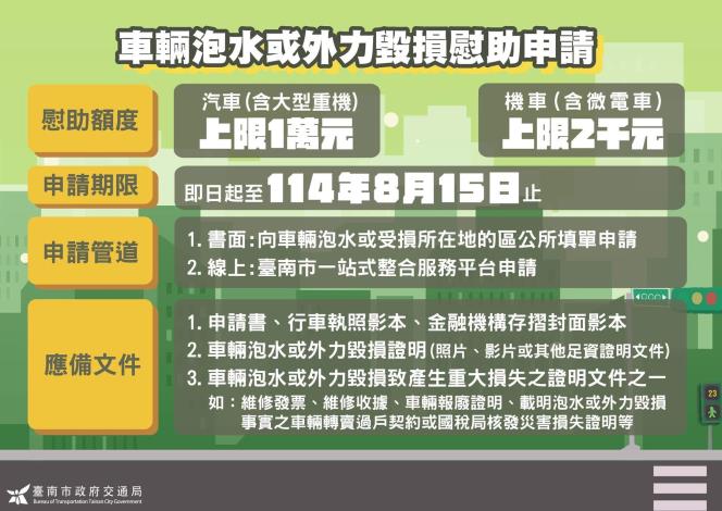 臺南市丹娜絲颱風車輛泡水或外力毀損慰助申請書(至1140815止)