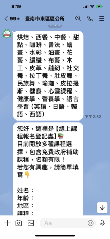近日有不肖份子假借東區區公所名義,利用LINE群組,辦理各項免費活動,騙取民眾個資,東區公所黃炳元區長再次呼籲,詐騙手法,無處不在,有關LINE群組系列課程非公所舉辦,請民眾切勿加入及傳送個資,若有疑義,請先致電公所洽詢。