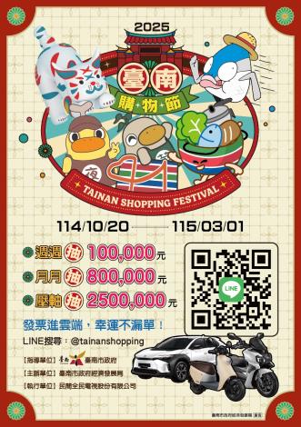 2025 年臺南購物節活動持續到明年 3 月 1 日 ,只要在臺南消費不限金額登錄,消費滿 50 元就可獲得抽獎序號,獎項包括百萬電動車、3C 實用家電、飯店住宿券等好禮,現金獎更是全面升級,月月抽 8 萬元,壓軸再抽現金 88 萬元! 12 月起更加碼推出「週週抽」,每週二抽出智慧電車與現金獎等總價值逾 10 萬元的獎項,驚喜連連。立即加入「2025 臺南購物節」官方 LINE 帳號,輕鬆完成消費登錄,來臺南旅遊 GO 購,買越多、抽越多,好禮大獎等你帶回家!