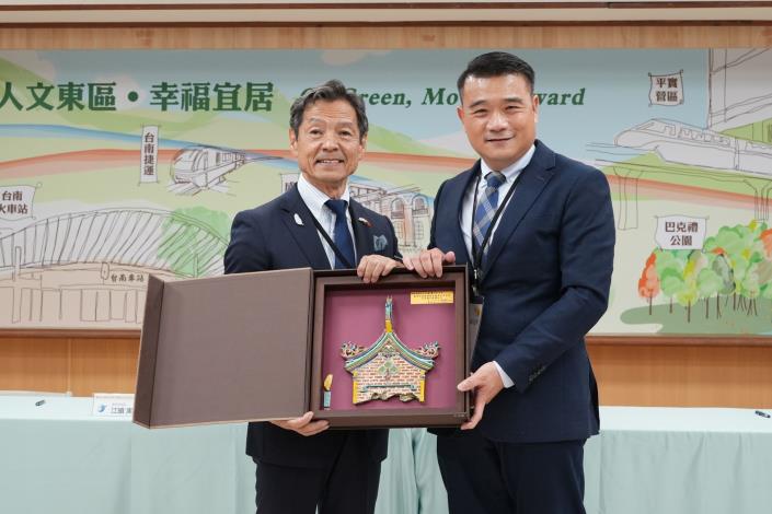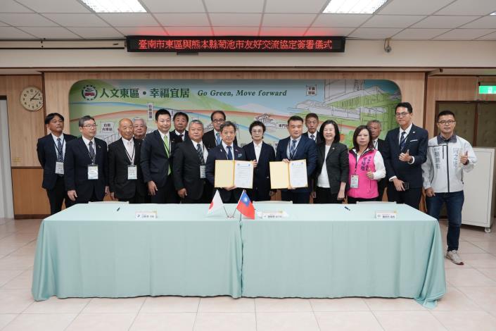 臺南市東區與日本熊本縣菊池市113年11月11日日在副市長趙卿惠、邱莉莉議長、曾培雅議員、李宗霖議員、臺北駐福崗經濟文化辦事處陳銘俊處長、民政局吳明熙副局長及東區各級民代、里長、校長的見證之下,東區區長黃炳元、菊池市市長江頭實在東區區公所四樓禮堂共同簽署了友好城市協定,旨在加強雙方的友誼,探索未來兩地在文化、經濟和觀光等多方面的合作潛力,共同推進地方交流。